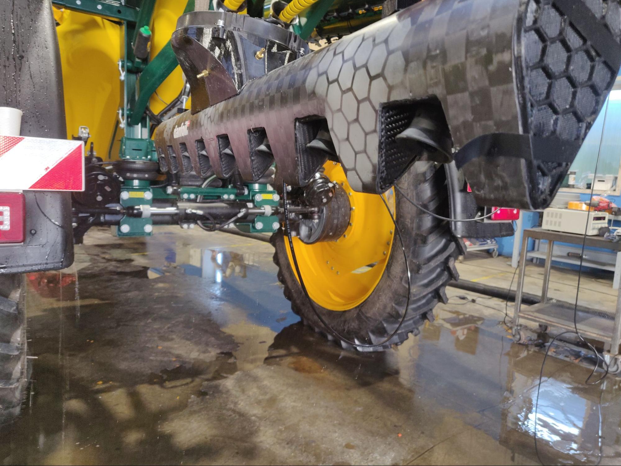 Prototypebom. Sprøjtebommen er opbygget i sektioner med en dyse i hver således at bommen kan udvides modulært. Væskestrengen kan ses på bommen samt sammenkoblingen til de enkelte dyser.