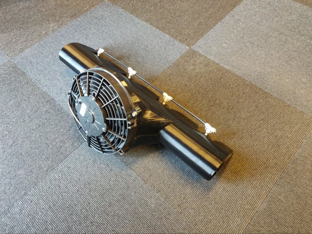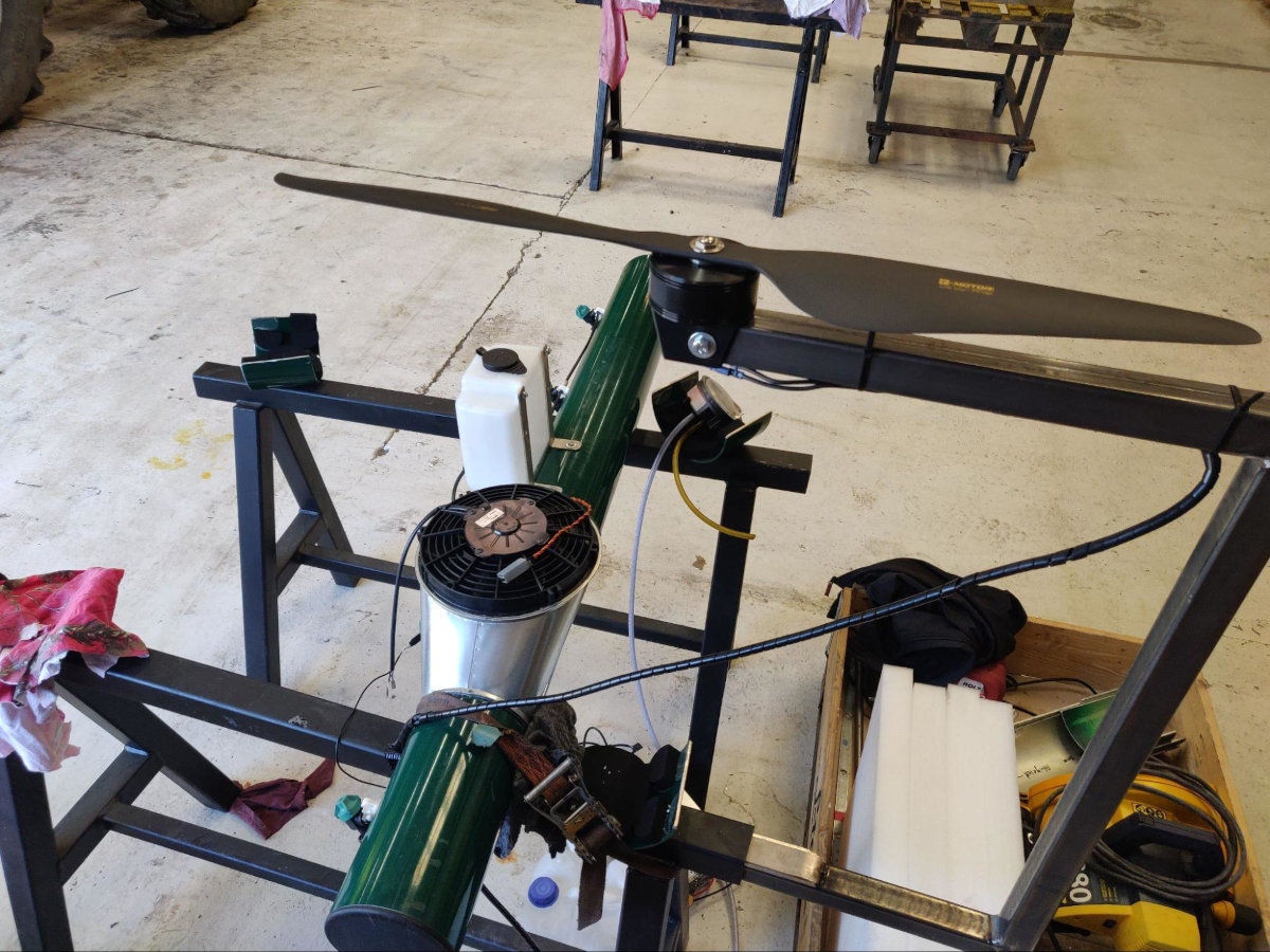 Test af montering af propel ovenpå bommen. Det virker som om, den kan hjælpe til at generere ekstra tryk i sprøjtebommen.